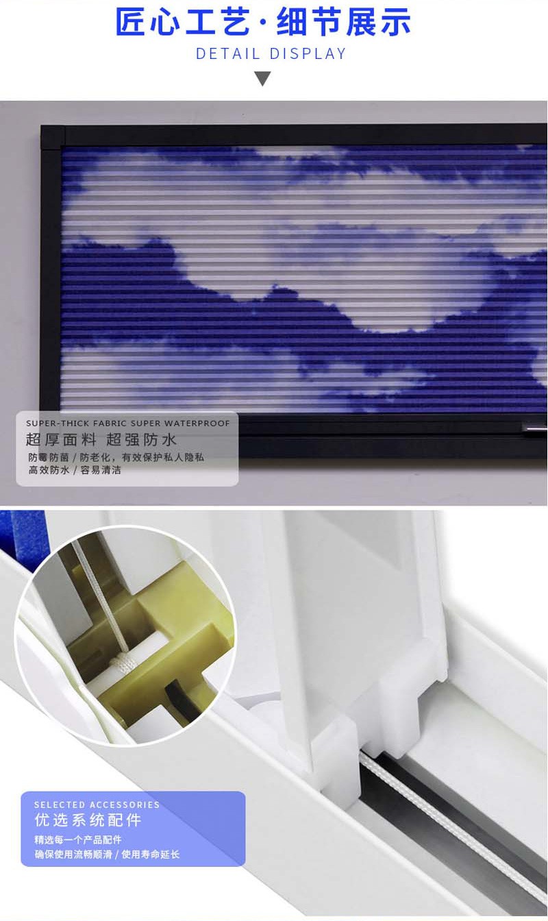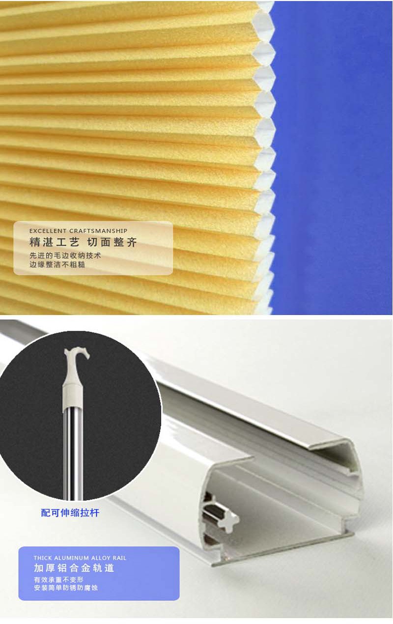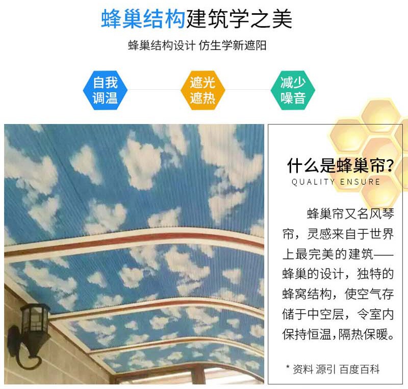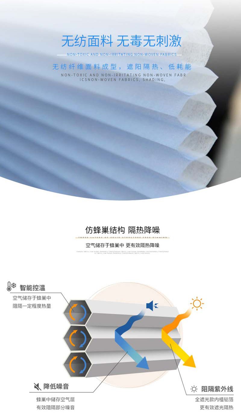 蜂巢簾又名風(fēng)琴簾,靈感來源與世界上最完美的建筑--蜂巢的設(shè)計(jì),獨(dú)特的蜂窩結(jié)構(gòu),使空氣存儲于中空層,令室內(nèi)保持恒溫,隔熱保暖。