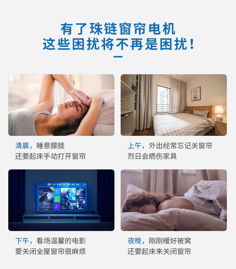 此產(chǎn)品適用于拉珠卷簾,可以把傳統(tǒng)的拉珠卷簾改變?yōu)橹悄茈妱?dòng)窗簾,安裝簡(jiǎn)單,操作方便。安裝后可通過遙控器、語(yǔ)音、手機(jī)APP等控制窗簾升降。
