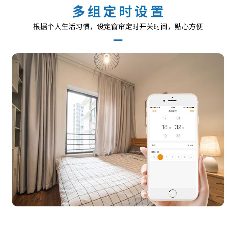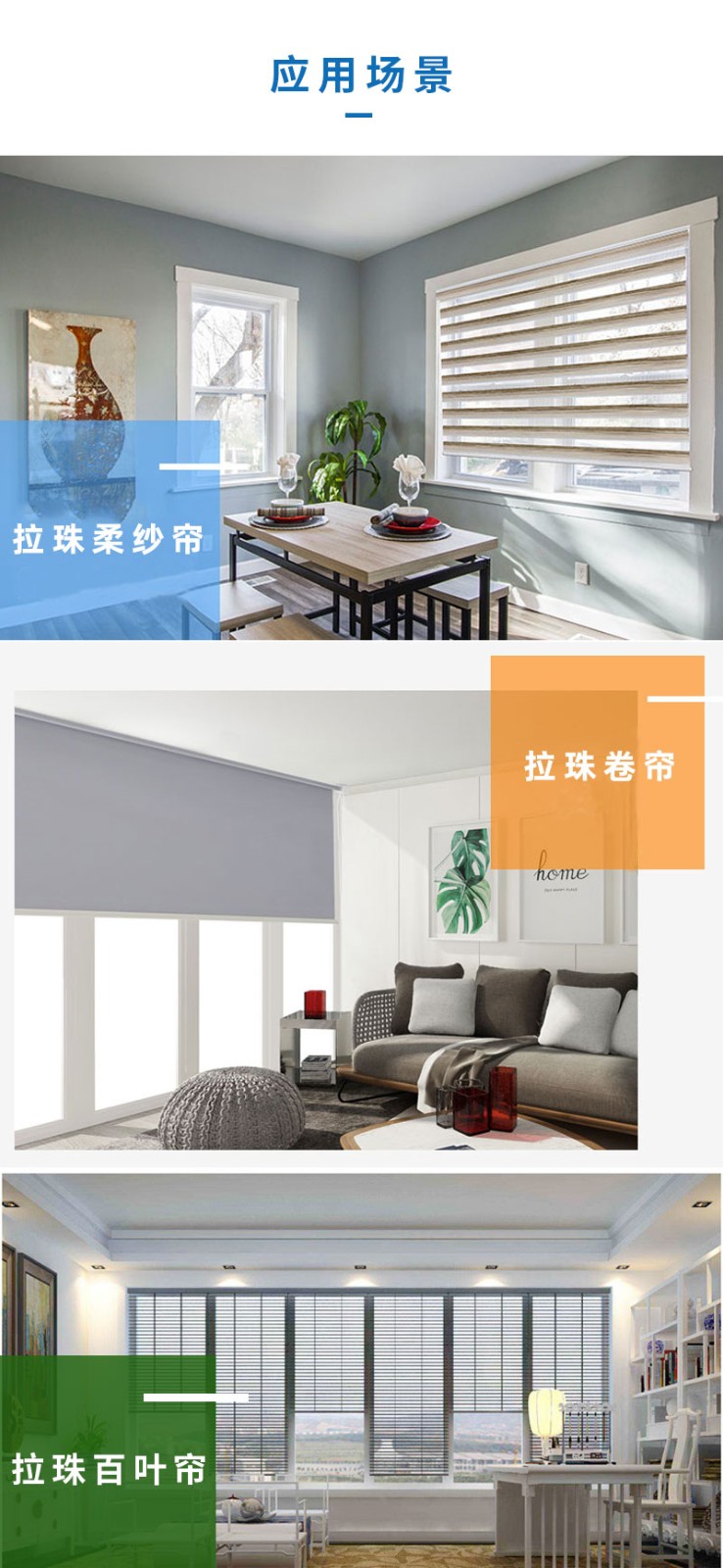 此產(chǎn)品適用于拉珠卷簾,可以把傳統(tǒng)的拉珠卷簾改變?yōu)橹悄茈妱哟昂?,安裝簡單,操作方便。安裝后可通過遙控器、語音、手機(jī)APP等控制窗簾升降。