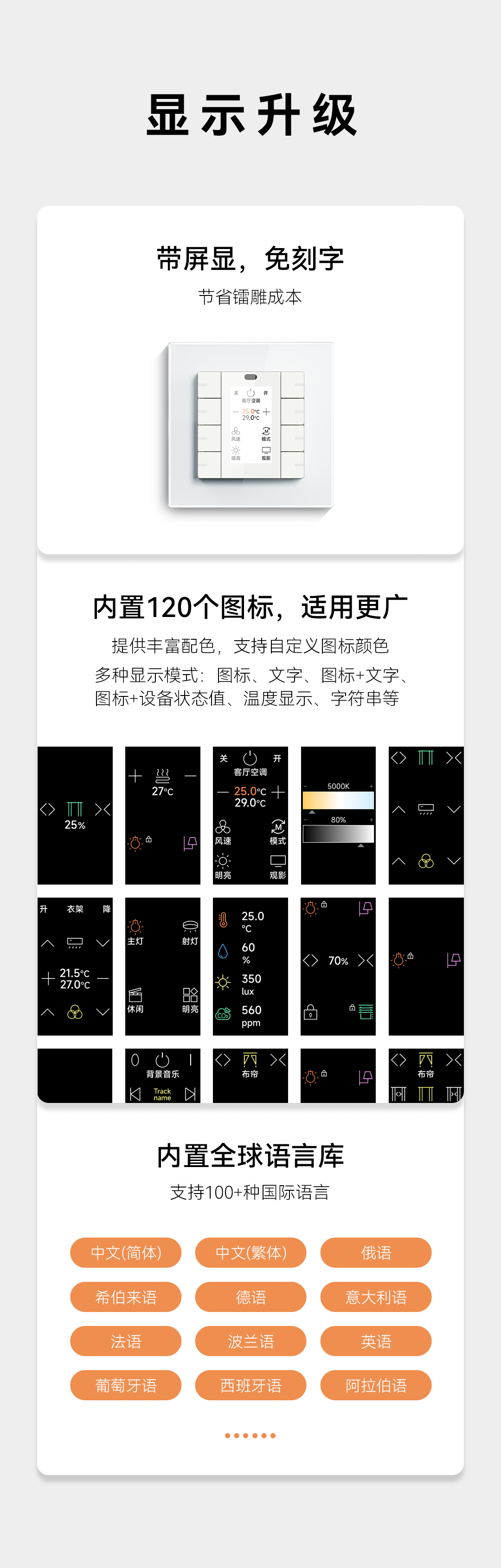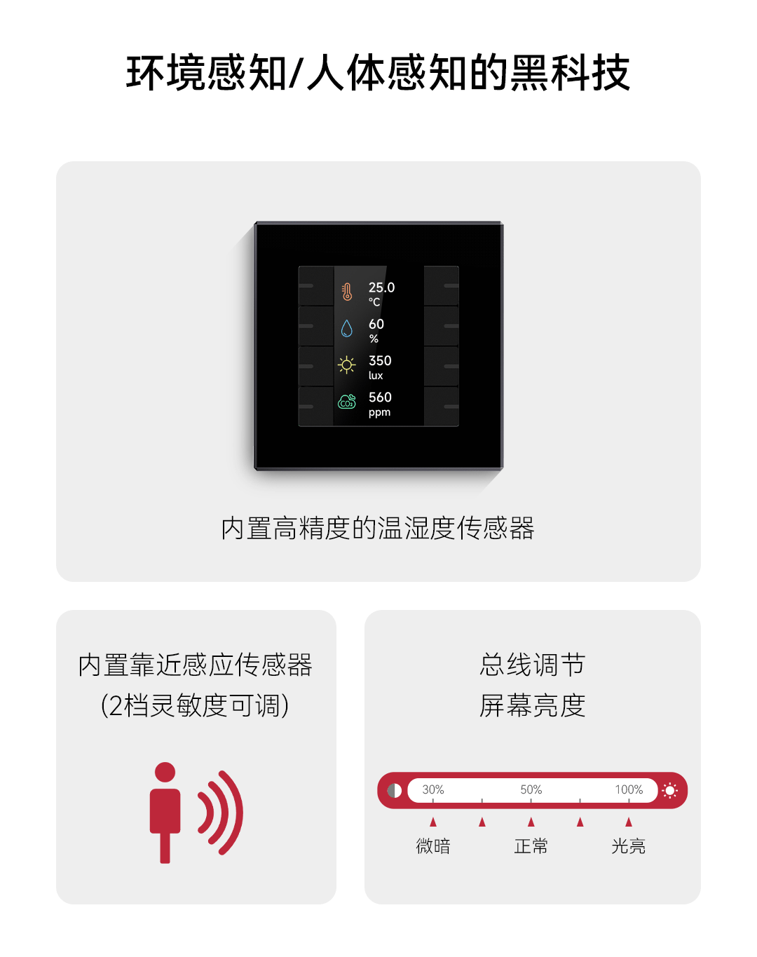 一款專為海外市場及追求高品質(zhì)智能生活的用戶設(shè)計的KNX總線智能面板,向歐洲大牌看齊,用歐洲標準工藝+可視化交互,替代傳統(tǒng)機械開關(guān),顏值高、功能全、適配廣