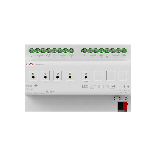 1/2/4 路通用調光執(zhí)行器(以下簡稱調光器)根據產品有 1/2/4 路輸出,可連接一些具有可調光性能的燈光設備(如白熾燈、鹵素燈、節(jié)能燈、LED 燈等),通過總線可以對這些燈光設備進行調光、場景預設、開關燈等操作,同時也支持 KNX 安全協(xié)議。采用導軌式安裝的調光器設計安裝在 35 毫米 DIN 導軌上的模數化設備,輸出端采用螺絲接線柱實現電氣連接。調光器的總線連接都是直接通過 KNX 接線端子連接,系統(tǒng)供電除總線外不需要額外的電源電壓。