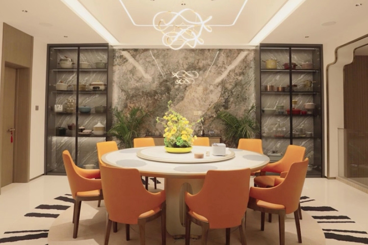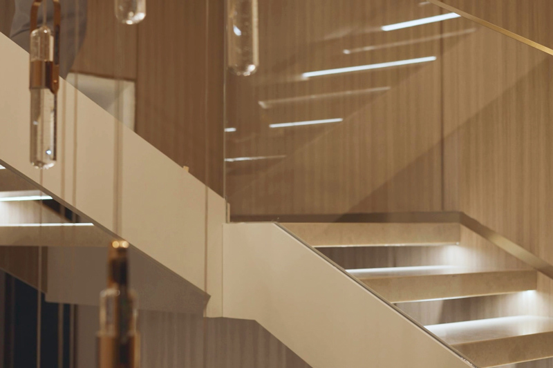 跟隨生活場(chǎng)景隨心調(diào)配燈光,中餐模式、西餐模式、會(huì)客模式、品茗模式......即使是同一個(gè)空間,也能營(yíng)造出不同的氛圍感貫徹一層負(fù)一層空間的踏步燈帶旋轉(zhuǎn)梯,燈隨人亮,靈動(dòng)智能,上下樓都有了別樣的趣味