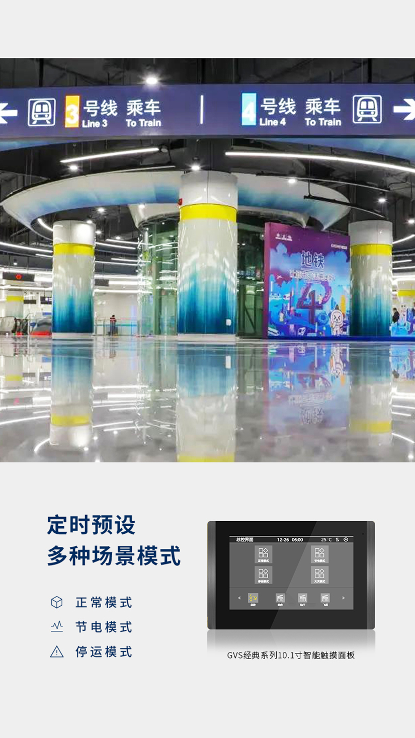 在3號(hào)線每一個(gè)站點(diǎn)中控室里,都安裝了一個(gè)GVS經(jīng)典系列10.1寸智能觸摸面板,在觸摸屏上,工作人員可以很清晰的看到站廳、站臺(tái)、入口以及站外等照明狀態(tài),直接滑動(dòng)按鈕就可以實(shí)現(xiàn)一個(gè)站點(diǎn)的燈光智能控制。